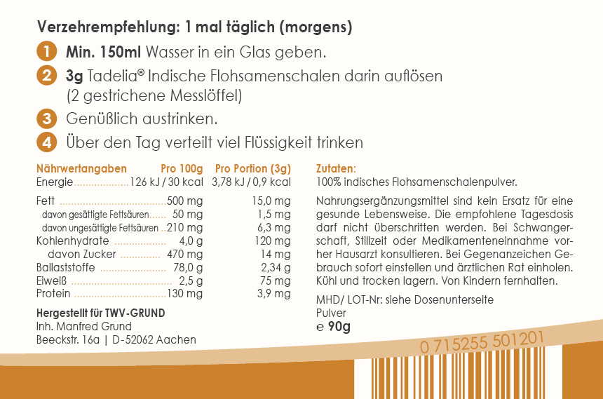 Tadelia® Indische Flohsamenschalen gemahlen ist ein Nahrungsergänzungsmittel, bestehend zu 100 % aus ganzen Flohsamenschalen.