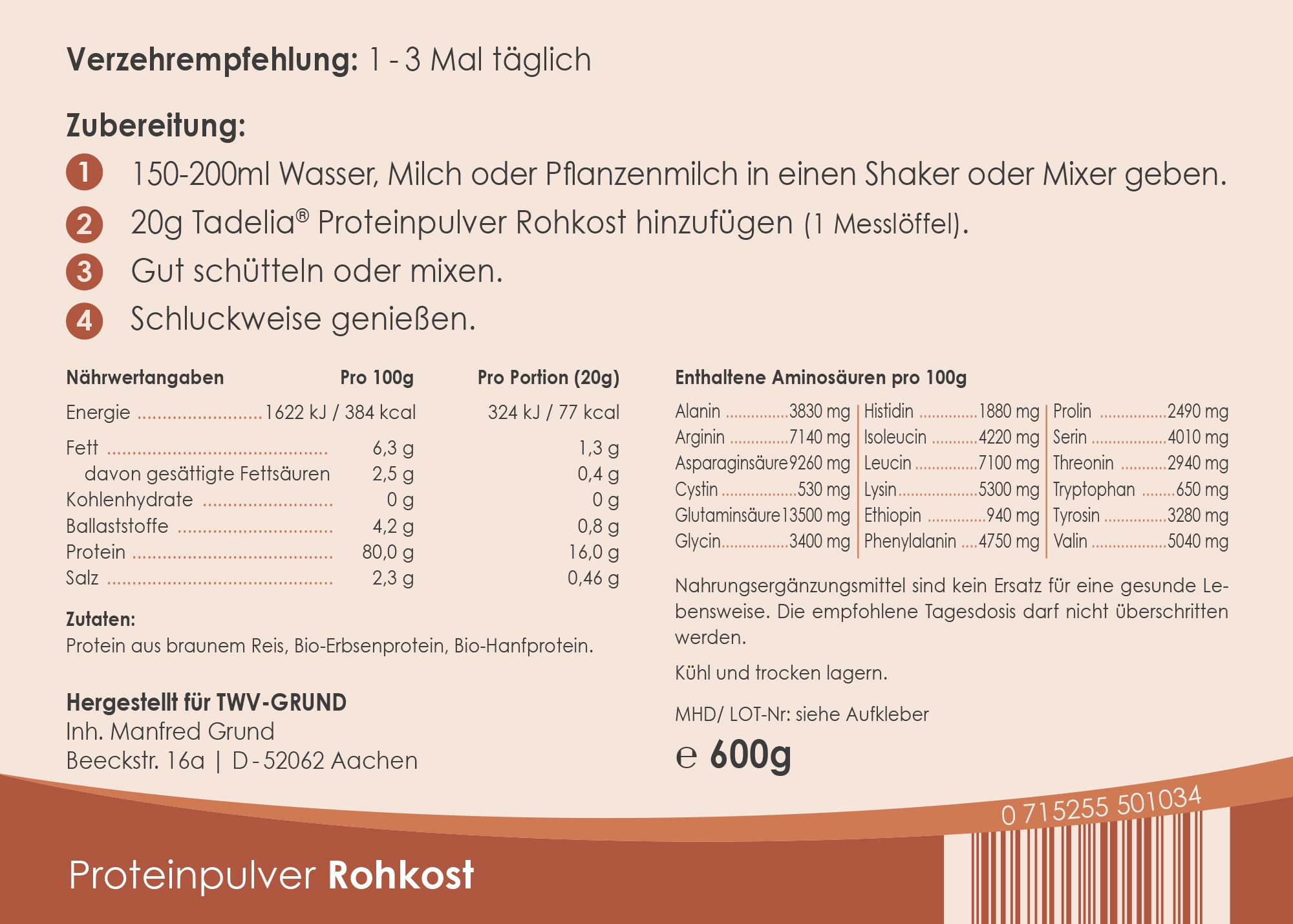 | 1 Beutel Proteinpulver (standard: Tadelia® Proteinpulver Molke WPC 80 - 800g) Erdbeere, Schoko, Rohkost |