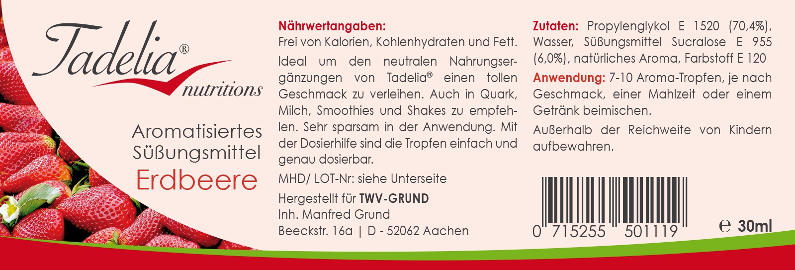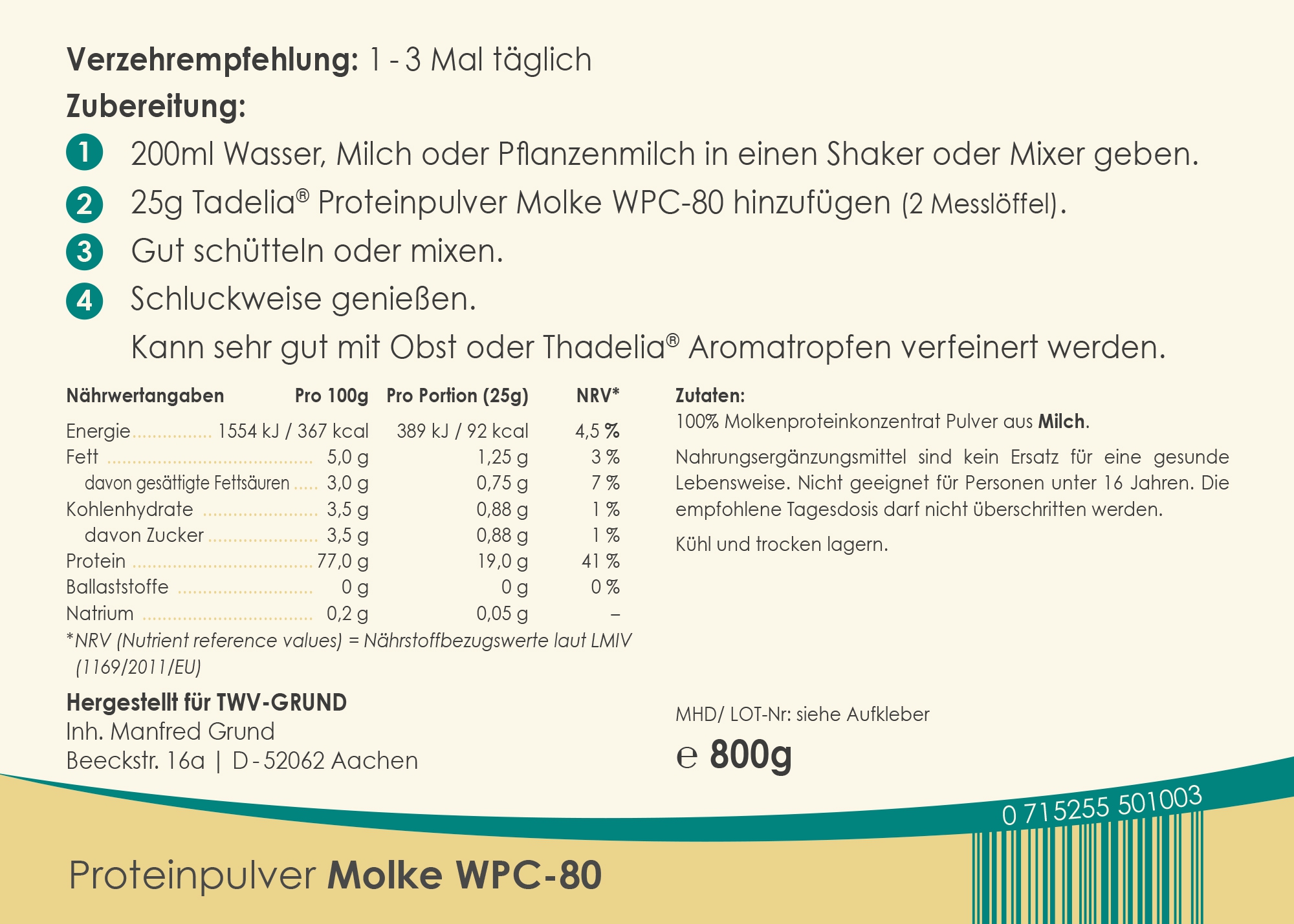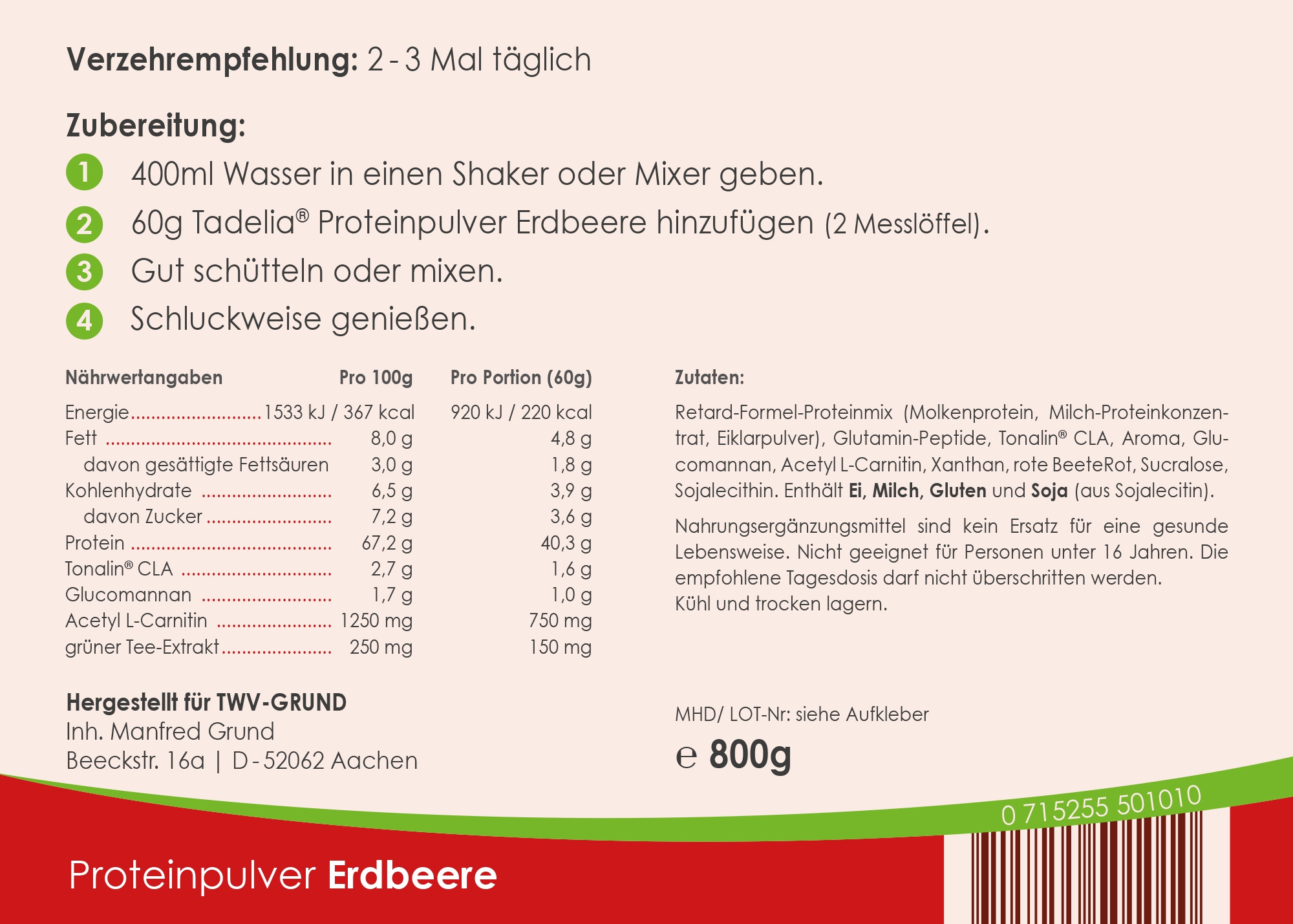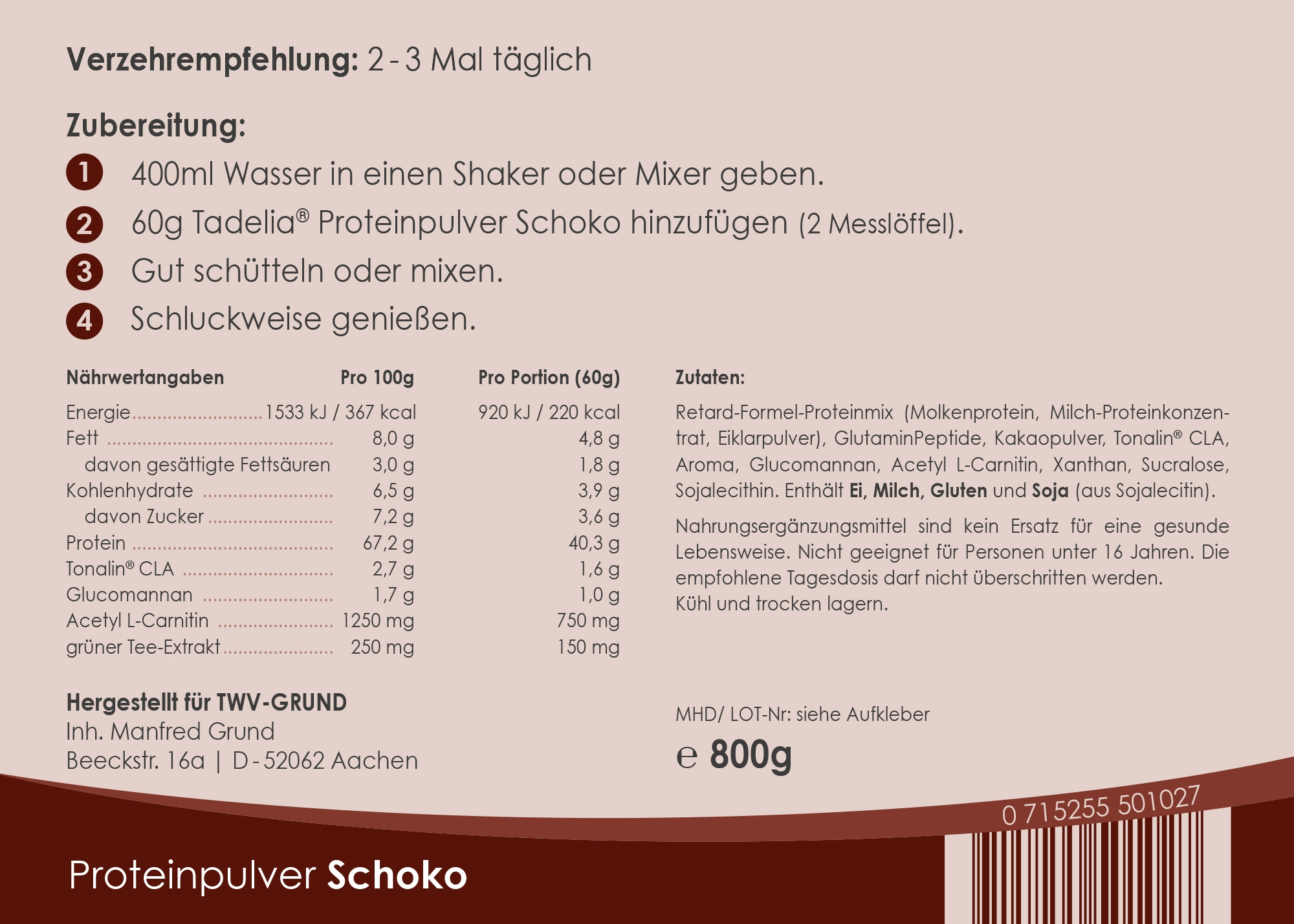 | 1 Beutel Proteinpulver (standard: Tadelia® Proteinpulver Molke WPC 80 - 800g) Schoko | Erdbeere | Rohkost |