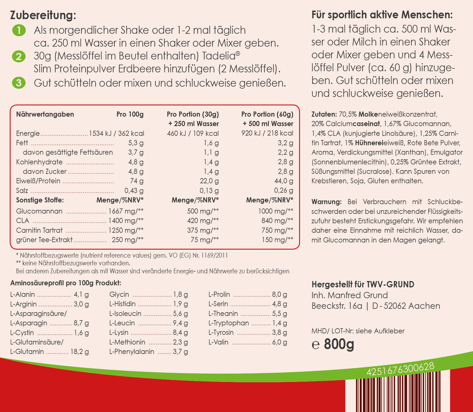 Was die fettverbrennenden Nährstoffe im Tadelia® Proteinpulver Erdbeere anbetrifft, so gehören dazu: